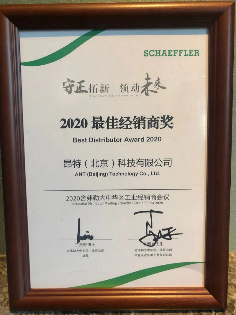 昂特(北京)科技有限公司作為舍弗勒A級經銷商,經過多年同舍弗勒集團的深入合作,榮獲殊榮: